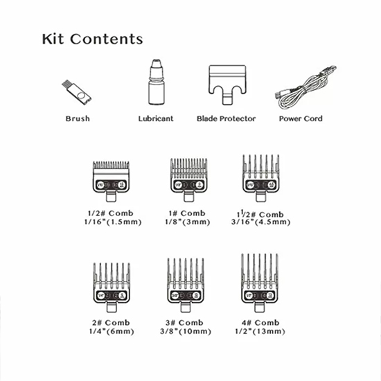 Пакетът включва: зарядно, четка за почистване, олио за смазване на машинките 50 мл, повдигачи, острие за смяна