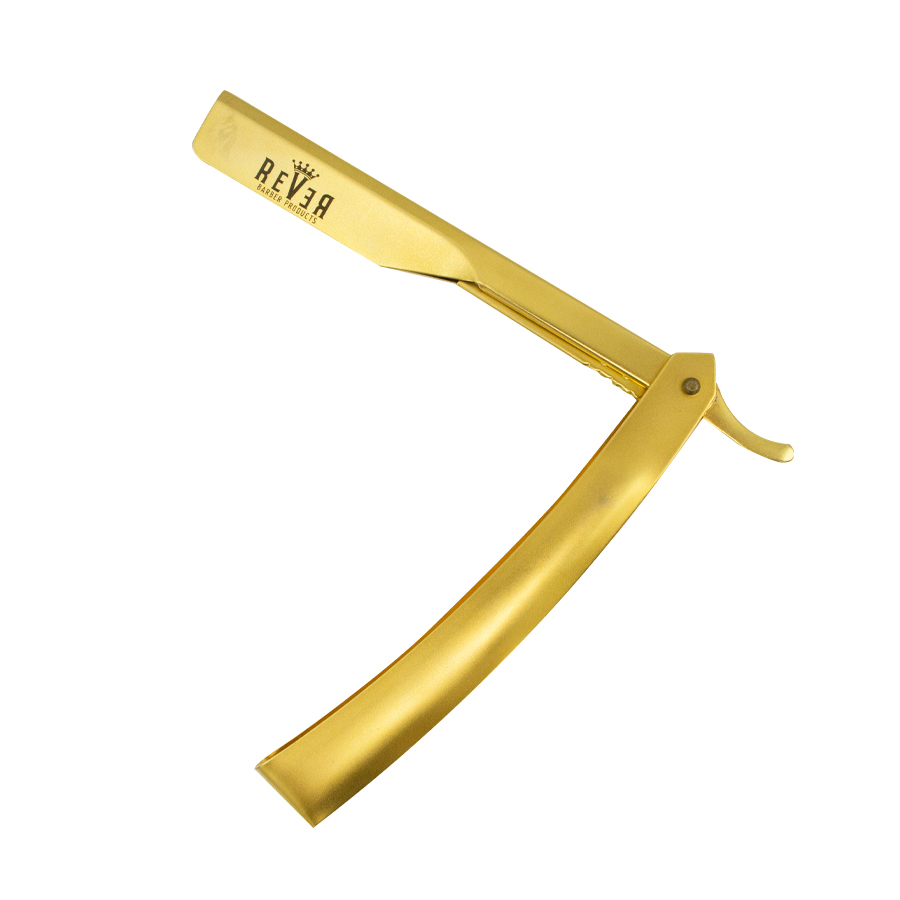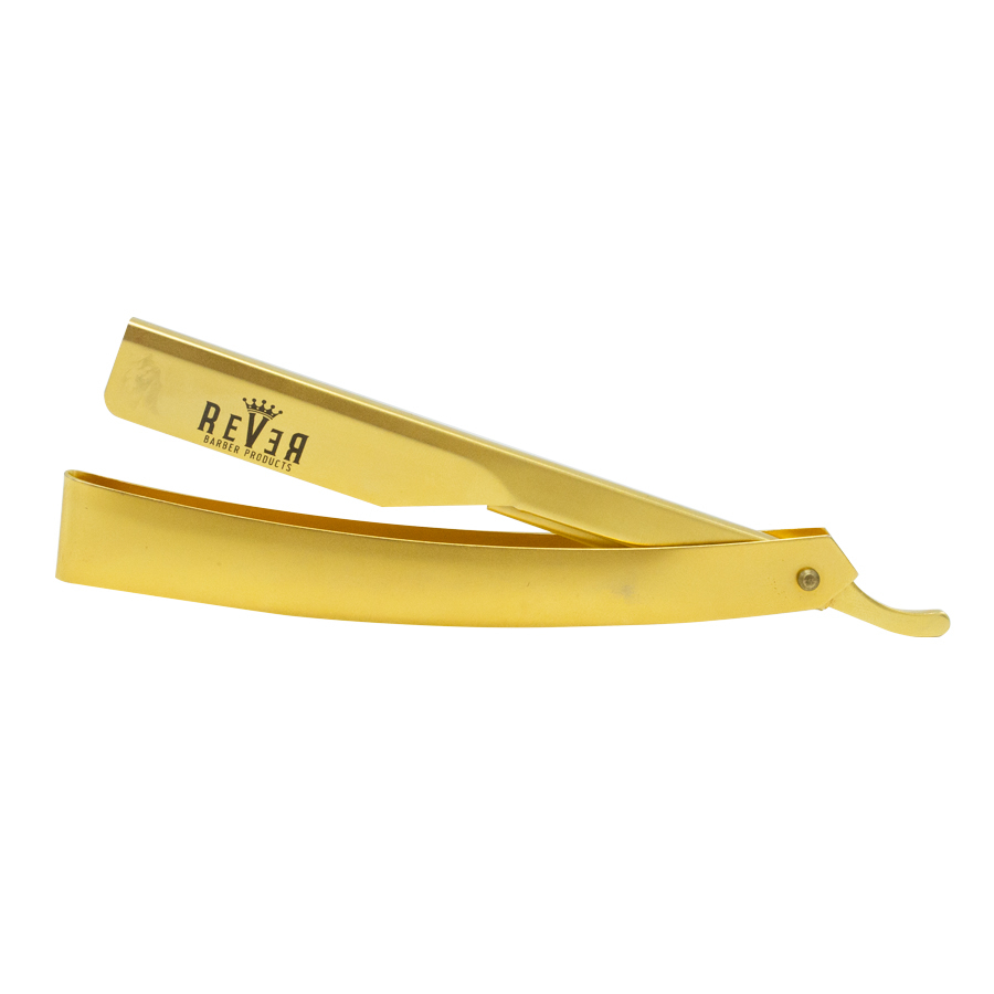 Възползвайте се от едно приятно и професионално изживяване с помощта на този бръснарски професионален бръснач от стомана с държач от златен метал, предоставен от REVER от 14.5 см (затворен) и 23 см(отворен) с тегло от 42 грама. Научи изкуството на бръснарството и необходимата техника ,,straight-edge’’ която може да бъде използвана с помощта на този професионален уред. Направи правилния избор за оформяне на краищата и контура на брадата, мустаците и страничната лента.