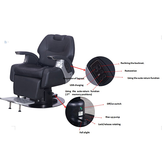 С напълно електрическо регулиране както за гърба, така и за краката, този бръснарски стол може да се наклони до 140 градуса, прелагайки комфорт и максимален релакс за клиента. Също така има памет която позволява да запазите желаната позиция, както и да върнете предишна позиия. Още повече стола е предвиден с функция на въртене до 320 градуса.