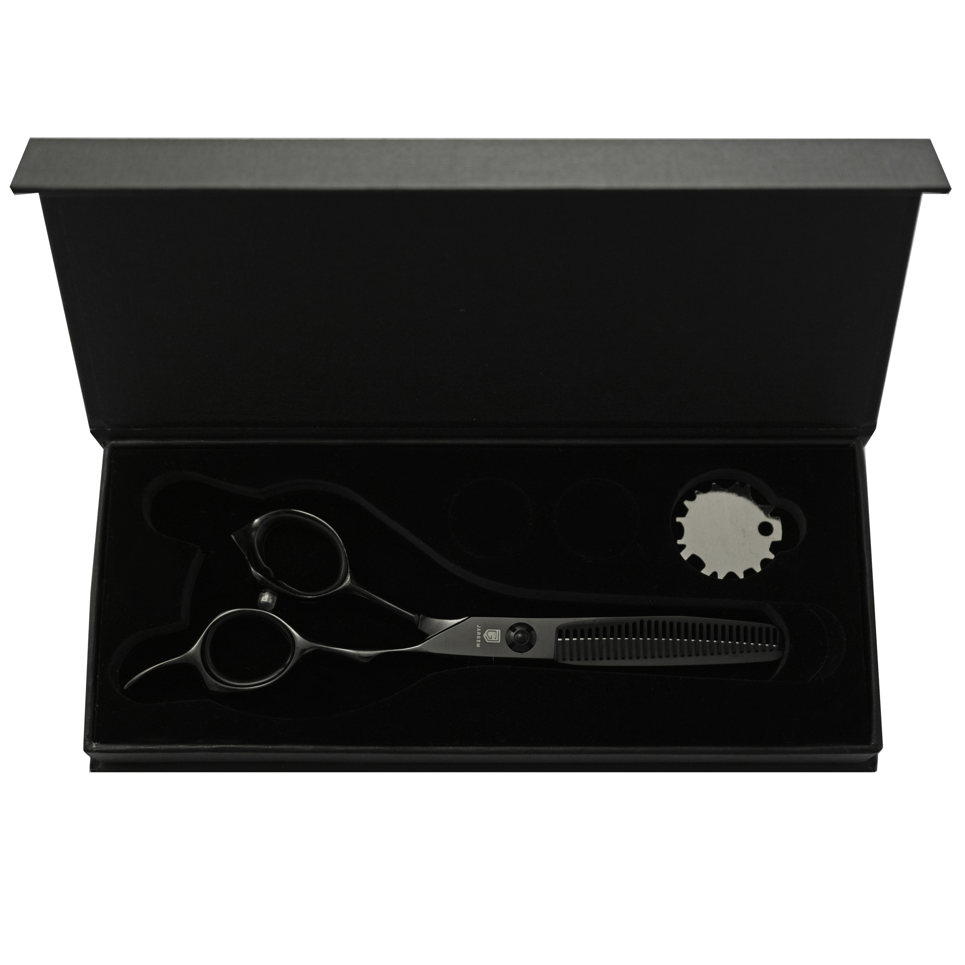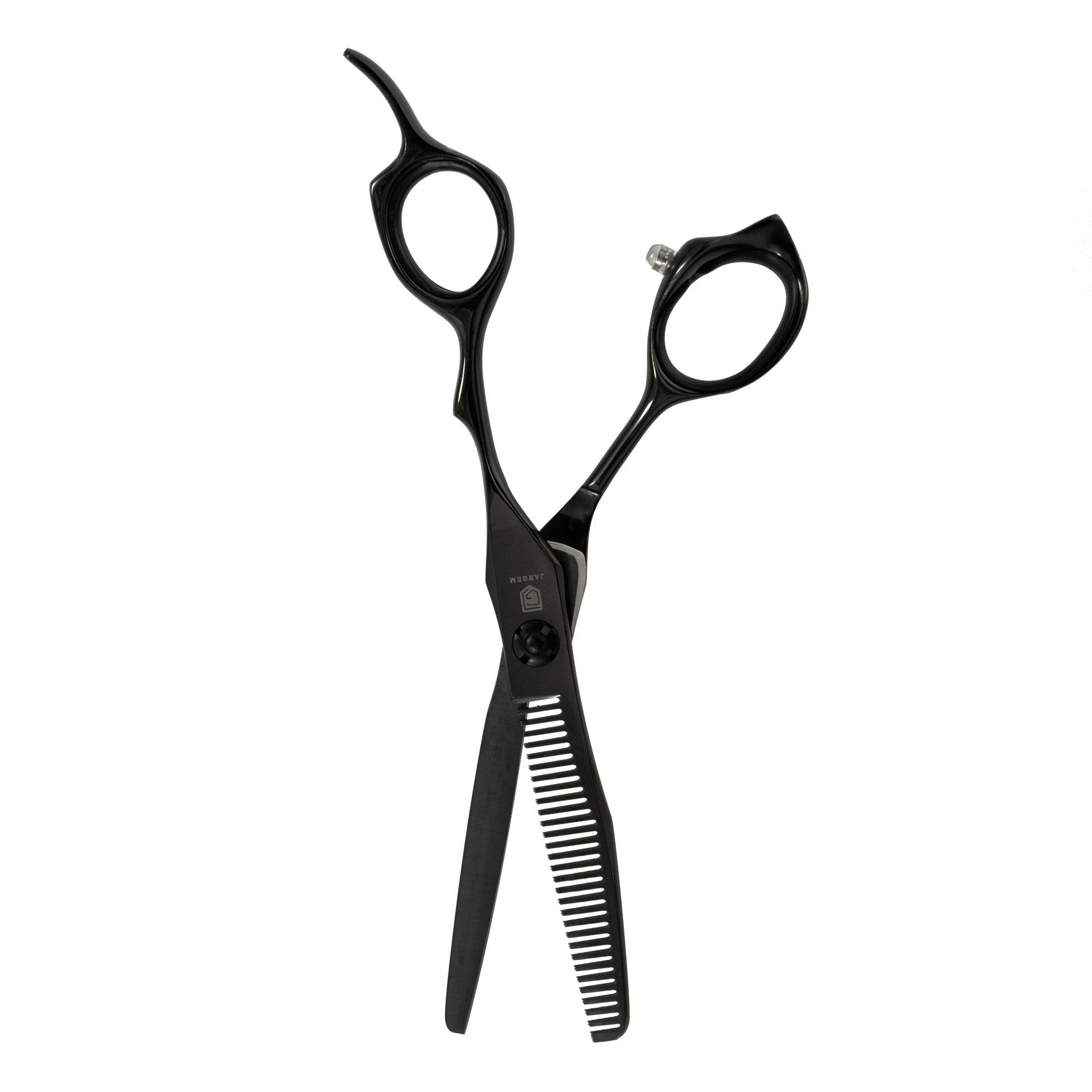 JARGEM - Филажна ножица - 5.75 инча - Черна Версия, изработена от японска стомана VG10, предлага по-голяма прецизност и по-бързо и фино подстригване на косата.
