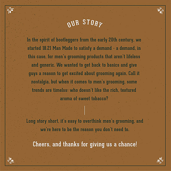 18.21 Manmade е известна марка от САЩ, символ на мъжествеността. Чрез продуктите за лична хигиена, насърчават мъжете да се чувстват уверени в себе си и да постигнат всичко което си поставят за цел. Опаковките са вдъхновени от епохата на prohibitiei когато се е крило пиенето или други ценни вещи в библиотеките. Серията е разнообразна, от шампоани за повече приложения, до олиа, парфюми и подходящи комплекти за подаръци които ще ги помни всеки мъж.