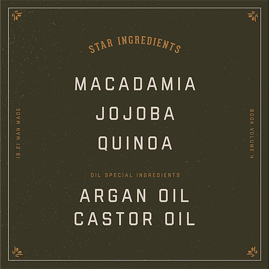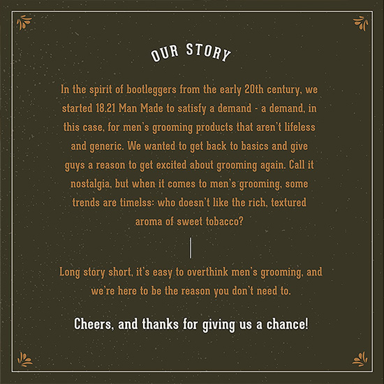 18.21 Manmade е известна марка от САЩ, символ на мъжествеността. Чрез продуктите за лична хигиена, насърчават мъжете да се чувстват уверени в себе си и да постигнат всичко което си поставят за цел. Опаковките са вдъхновени от епохата на  prohibitiei когато се е крило пиенето или други ценни вещи в библиотеките. Серията е разнообразна, от шампоани за повече приложения, до олиа, парфюми и подходящи комплекти за подаръци които ще ги помни всеки мъж.