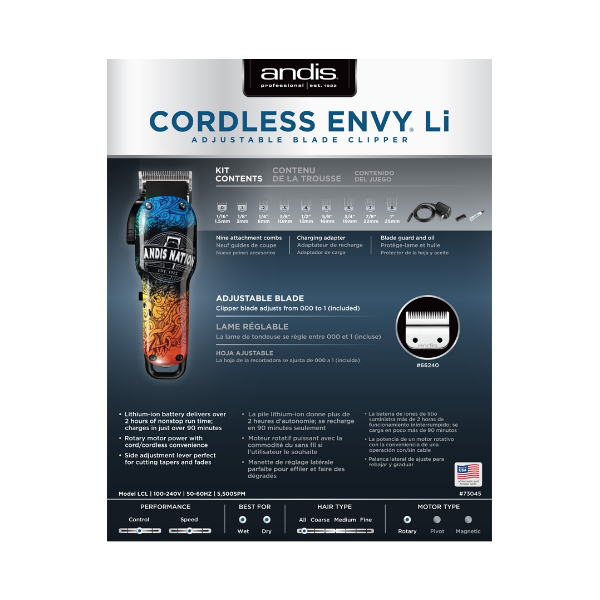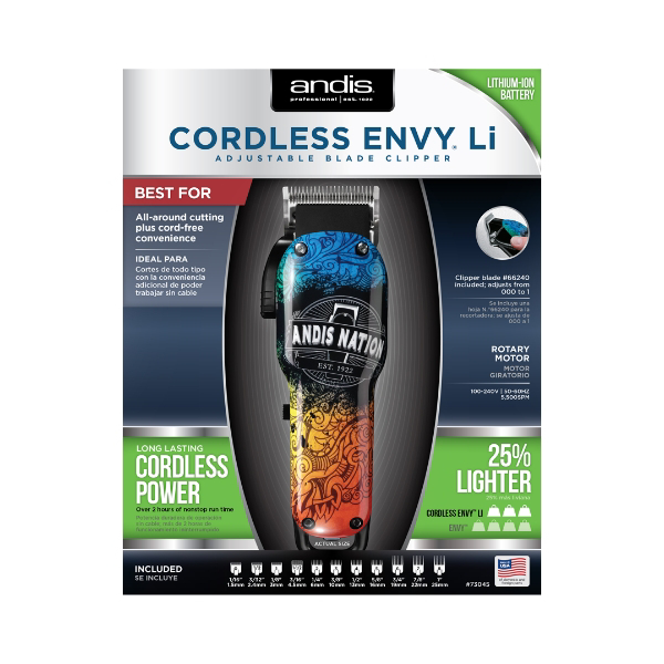 ANDIS - Безжична машинка за подстригване Envy Nation с уникален дизайн и мощен мотор, който достига 6000 оборота в минута, може да бъде перфектният избор за всеки фризьор.