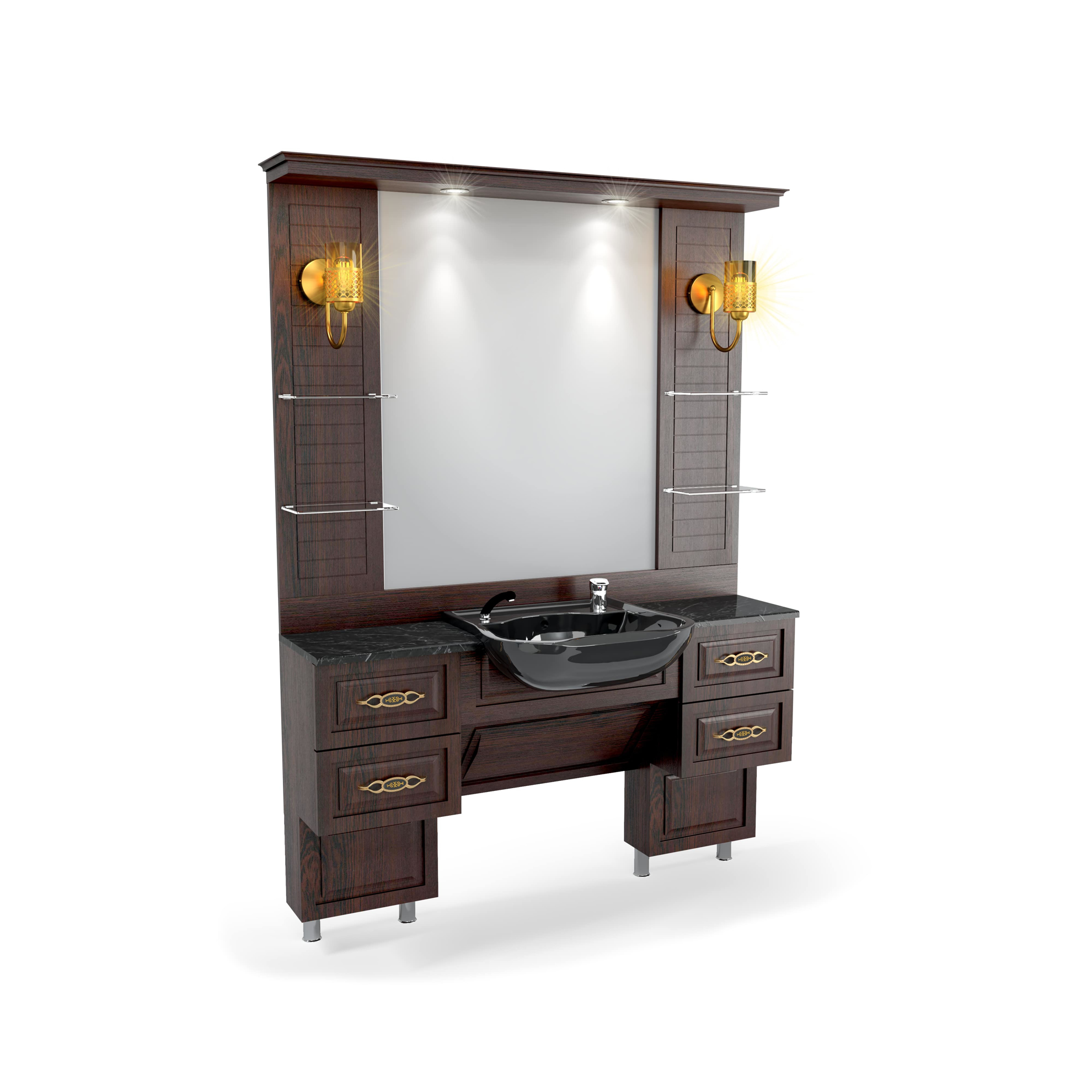 Използвайте максимално добре работното място с помощта на мебелите създадени от SOMPREMIUM. Материалът е много издръжлив, от MDF , с мивка, хубаво вргадено осветление и плъзгащи се чекмеджета. Дизайнът е иновативен, с тъмни цветове, подходящи за бръснарски салон.