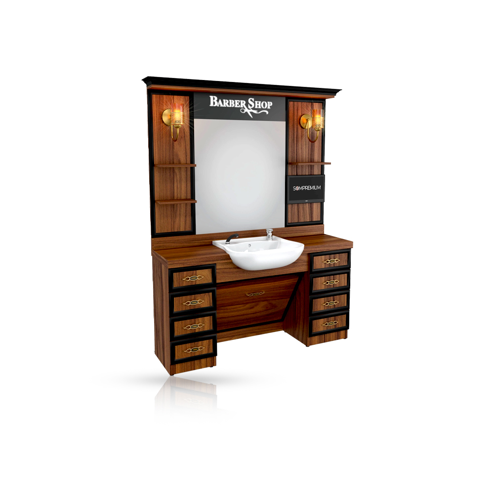 Използвайте максимално добре работното място с помощта на мебелите създадени от SOMPREMIUM. Материалът е много издръжлив, от MDF , с мивка, хубаво вргадено осветление и плъзгащи се чекмеджета. Дизайнът е иновативен, образуван от хубави тъмни тонове на цветовете.