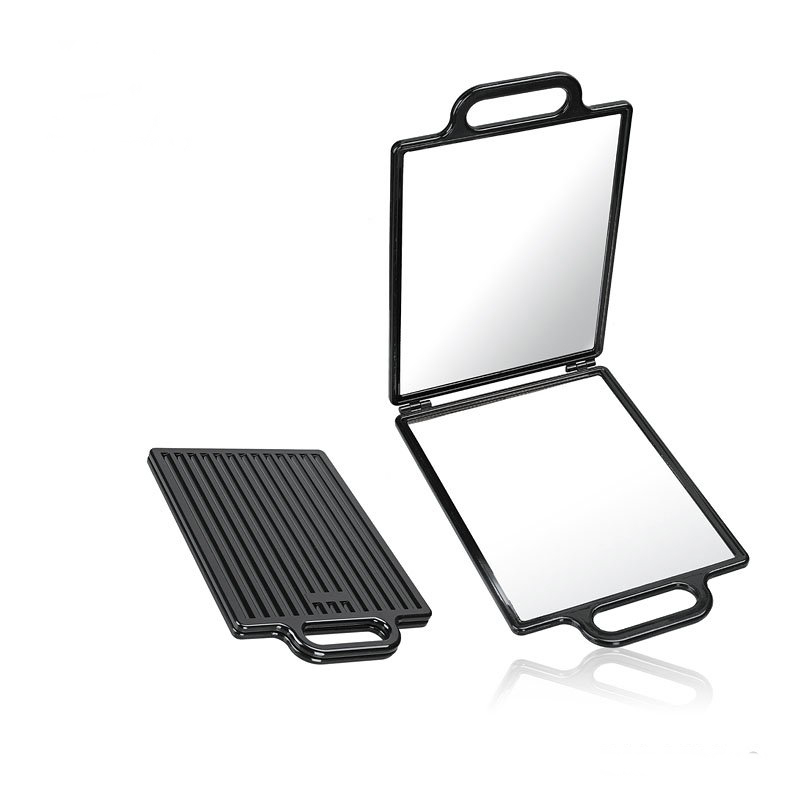 Много практично огледало, предоставено от BARBER STORE, удобно е благодарение на размерите си и лесно за транспортиране. Рамката на огледалото е от черна пластмаса, предвидена с дръжка за по-лесно използване и ухо за закачане.