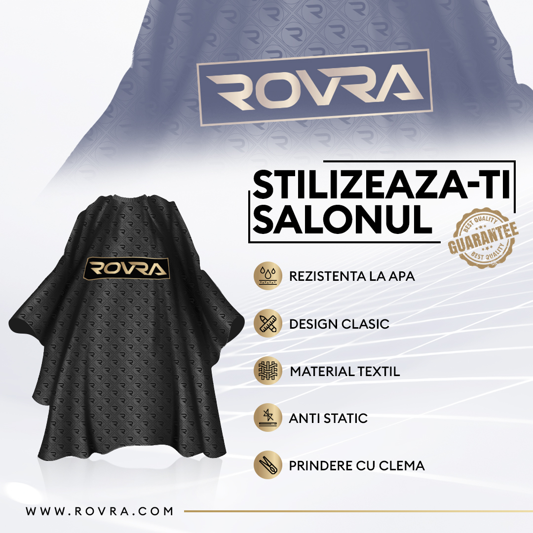 ROVRA се затвърждава на пазара благодарение на качествените си продукти , но този път се отличава благодарение на пелерините които улесняват работата на професионалистите. Пелерината е със здрав материал и създава непромукаема бариера за водата и косата.